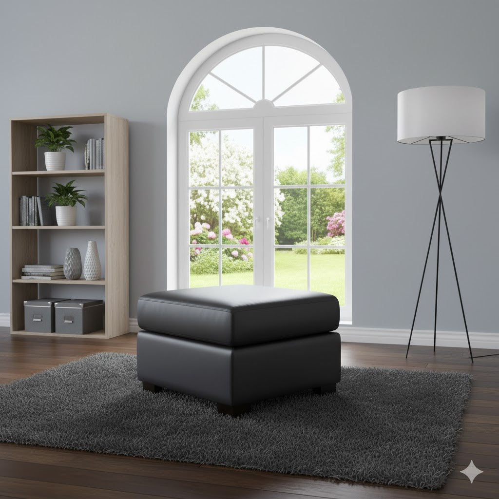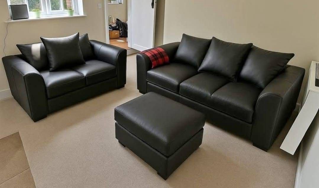 Transform your living room with this luxurious 3+2 seater black faux leather sofa set, complete with a matching footstool for added comfort and style. Designed with a modern minimalist look, this set perfectly balances elegance, comfort, and durability, making it ideal for any home.